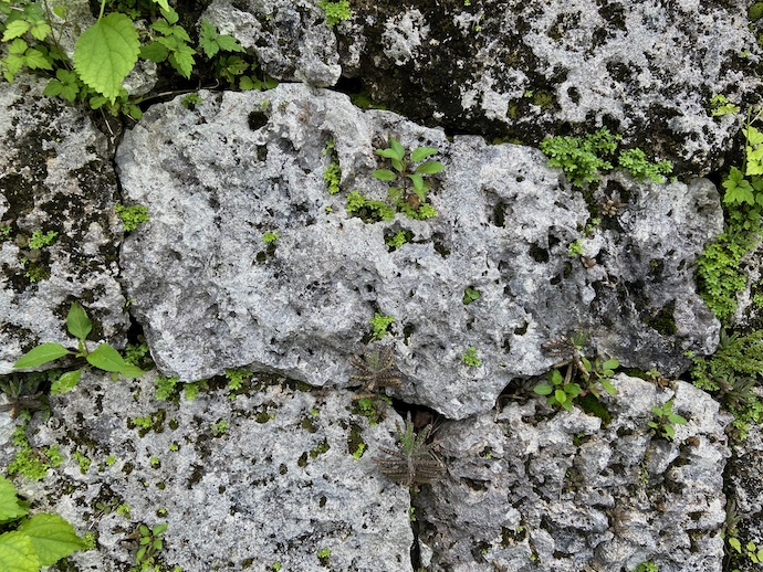 石垣に近づいてみると、積み上げたた石に窪みがあるのが見える。サンゴが固まってできた石灰岩なのだそうだ。石灰岩は加工が容易なので、整形された石が隙間なく積み上げられている。戦国初期の山城では天然石をあまり加工せず積み上げているので、隙間だらけの石垣になっているのとは大違いだ。
