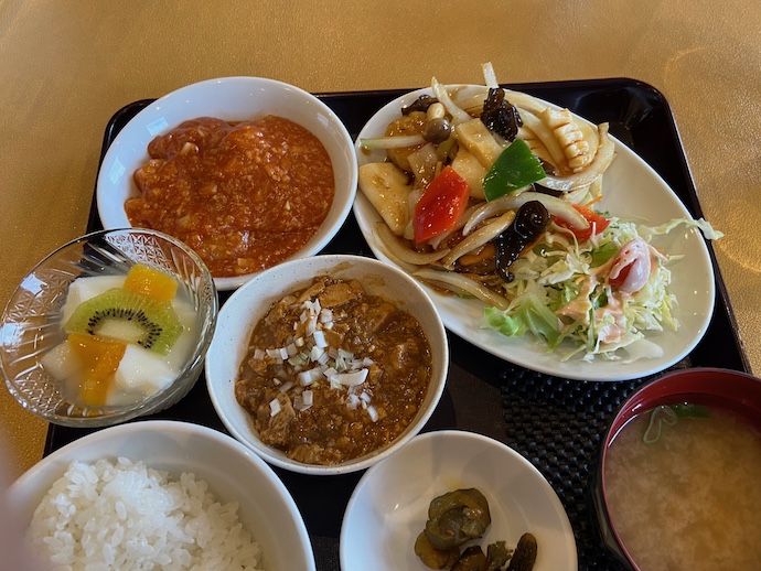 注文したのは日替わり定食の一番高いやつ、C定食950円 税込だ。おそらく町の中華料理屋で頼めば1500円 税別くらいは取られそうだ。麻婆豆腐とエビチリがサイド扱いで、メインはホタテとエビの炒め物。これが予想外にうまい。なぜ定番にしないのかと思うくらいうまい。デザートは杏仁豆腐なのでほぼパーフェクトな定食だ。