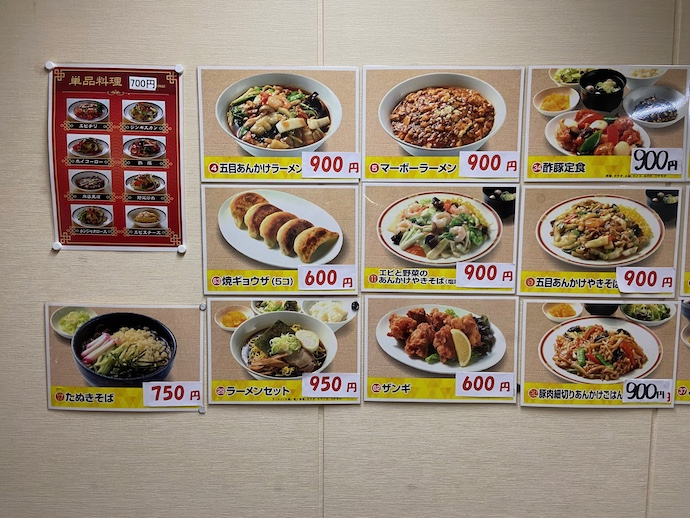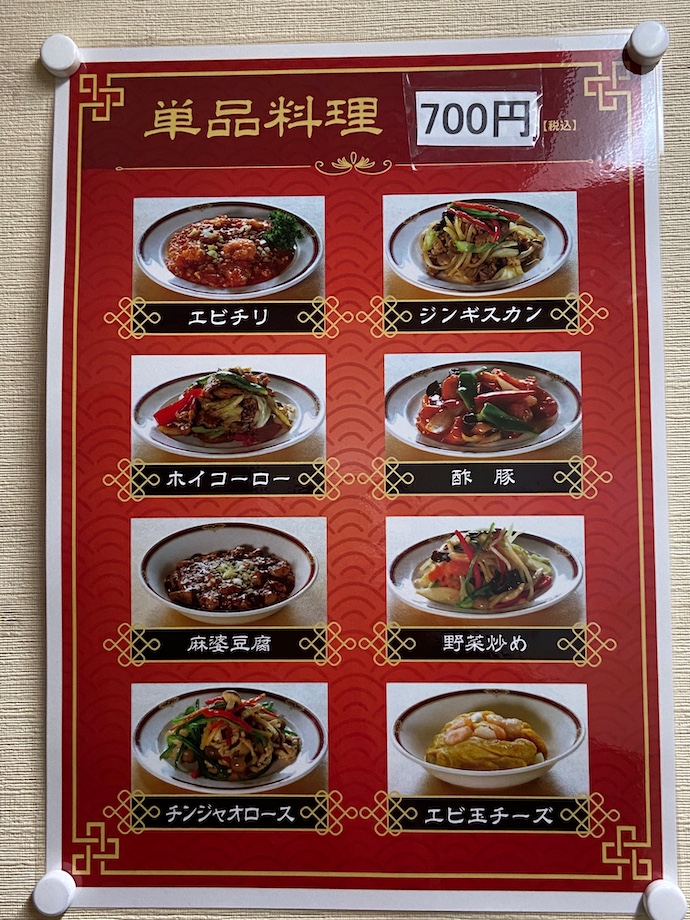 この値段を見よ。単品全品700円。中華の一般的な料理はもれなくカバーされている。「官」の表現を使えば、「一般市中価格」(なんと差別的な響きがある官僚言葉であることか)をはるかに下回るリーズナブルというより、とてもお安い価格だ。物価高のご時世、これはもはや絶滅危惧種と言って良い。おまけに税込表示だ。