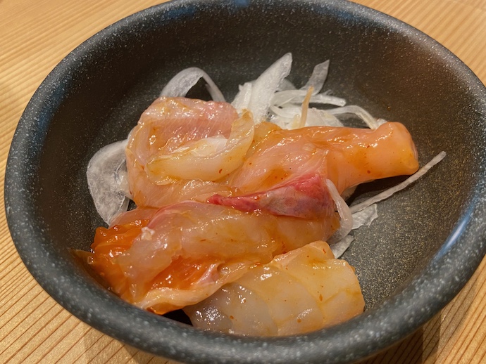 この海鮮ユッケを試してみると、中身はサーモンとブリのようで、確かに白身で油の乗った魚が辛味と醤油と胡麻油という強い味付けには向いているのだろう。