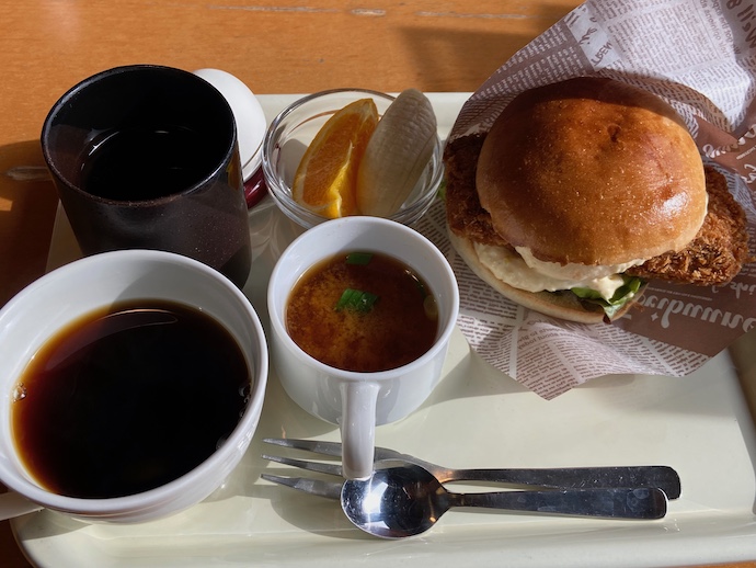 バンズからはみ出る大ぶりのシイラフライは朝飯にはちょっと大きすぎるみたいだが、タルタルソースとの相性は抜群で、勢いをつけて完食した。