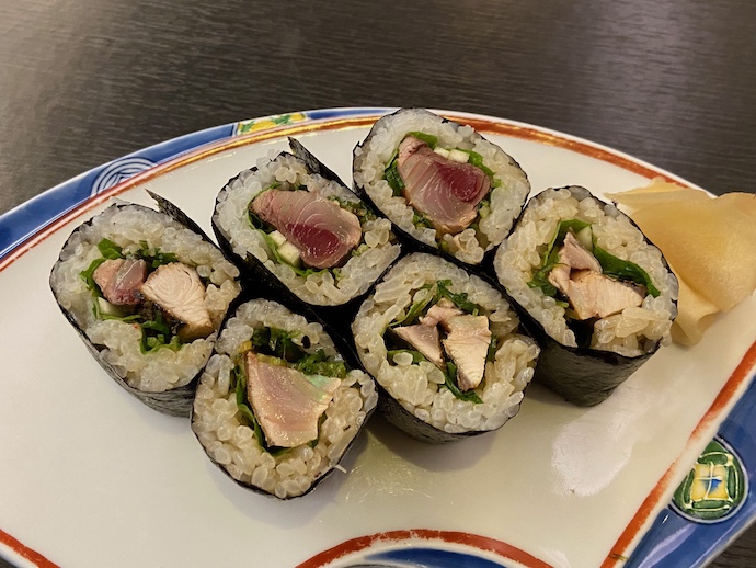 高知の繁華街帯屋町のアーケードの中に鮨屋がある。昔から気になっていたが、河内でわざわざ寿司を食うこともあるまい。河内名物のあれこれを食べたほうが良いと思っていた。が、今回は「土佐巻き」の研究をするべく、街中の鮨屋を物色してみた。不思議なことに鉄火巻きはあっても土佐巻きを置いていない鮨屋ばかりだった。