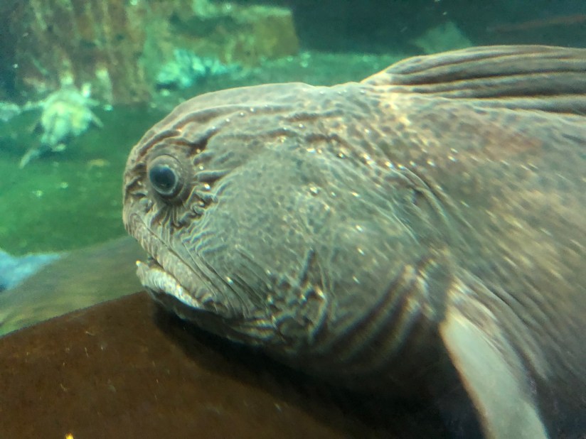 このオオカミウオの顔が異様というか醜悪というか、魚界でも屈指の「コワモテな顔」だ。この顔をゆっくり眺めていると、人生のあれこれを悩んでいたとしても全てが忘れられる。人間に生まれてよかった、オオカミウオに生まれたら自分の顔を見て人生?に絶望してしまうに違いない、などと大変失礼なことを感じてしまうからだ。