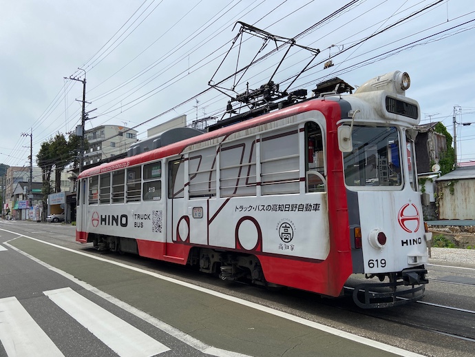 高知市内を走る土佐電鉄の車両はほぼ完全にラッピング電車なので、一台一台見栄えが違うが、この「日野」バーションが一番スッキリしている感じがする。ラッピング電車は走る広告なので企業イメージを表現する大事な装置なのだが、街中を走っている電車を見ると、センスのいい物、悪い物の差が激しい。ダサダサなデザインを見ると広告を発注する企業の見識が疑われるという物だ。まあ、地元には上手なデザイナーが少ないということかもしれない。