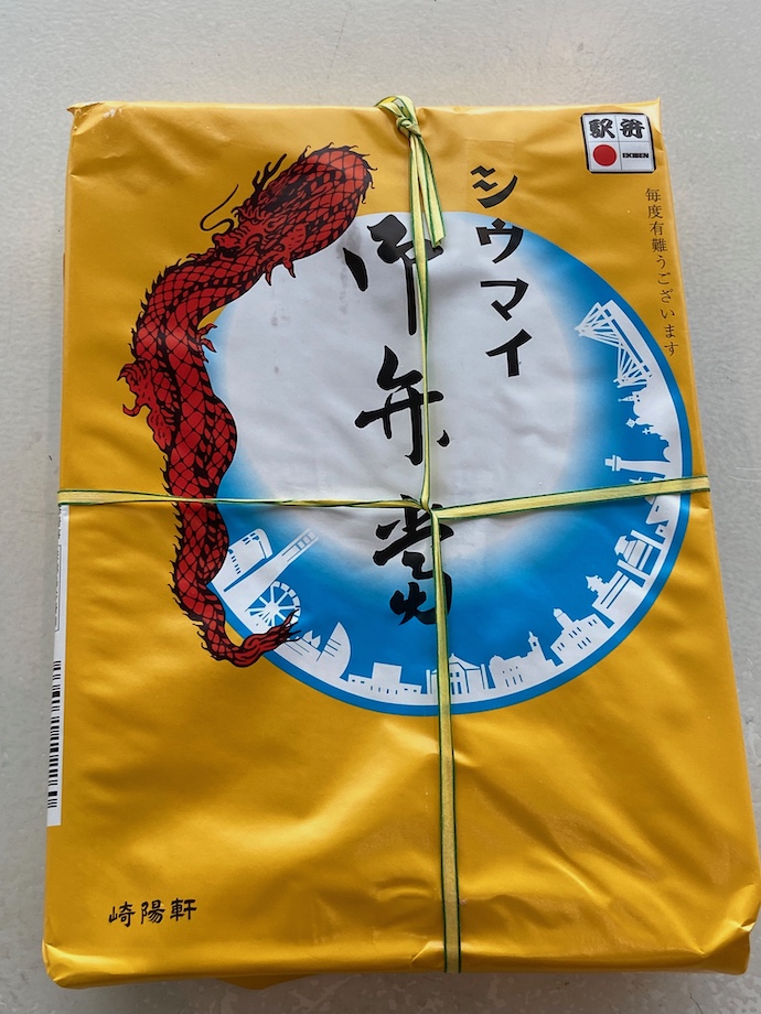 そして、こちらも不動のチャンピオン、横浜名物?シウマイ弁当だ。崎陽軒には横浜工場と東京工場があり、この紐がかかっている方が横浜工場製だったかな?(上大覚えで正確ではない)