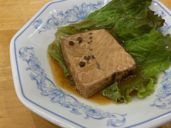 追加で、前々から気になっていいたカジキマグロのチャーシューも頼んでみた。どんなチャーシューになるのかとおもていたが、普通に醤油煮にした魚ではないか。黒い粒々は胡椒だが、あまり胡椒感はない。何というべきか言葉に迷うが、缶詰のカツオ醤油煮みたいなものだろうか。フレークになっていないから「煮カジキ」と言われた方がピンとくる。