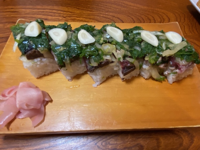 さて、これが大変おいしい。(個人的な感想です) カツオ好きでニンニク好きで押し寿司好きであれば、誰でも気にいると思う。土佐巻より好みかもしれない。それだけで食べとも美味いカツオを、押し寿司にするのはちょっともったいない気もするのだが、実はこの形の方がもっと美味しくなると思うのは自分だけ?