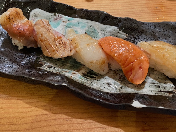 一皿に二貫乗せているのが基本だが、中には5貫セットというメニューもある。自分でもわがままだと思うのだが、「お店にお任せ」のセットには必ずと言って良いくらいサーモンが入ってくる。これがいけない。光もので言えば鯖が一番好みで、あじは良い。だが、イワシは勘弁してほしい、みたいな好き嫌いがある。なので、好きなものだけも5貫セットは、実に嬉しい。