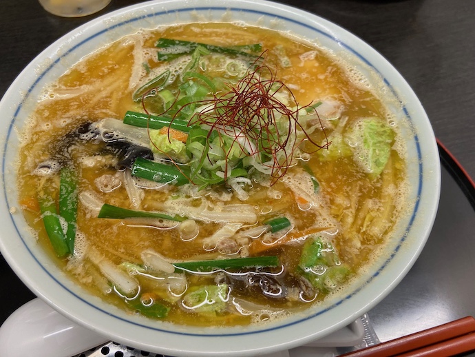 見た目は実に北海道的味噌ラーメンだ。間違いない。炒めた野菜が乗っているのが、北海道純正味噌ラーメンでありスタンダードモデルだろう。北海道味噌ラーメンはチャーシュー抜きであることが多いが、これも野菜とひき肉が炒めたものを載せるのでチャーシューなしだった。麺は旭川ラーメンの特徴である細めで腰のあるタイプなので、ちょっとあっさり系な食べ応えになる。