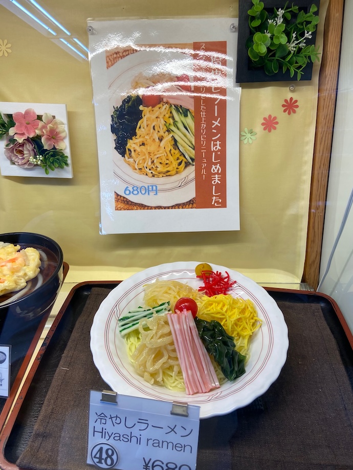 食券を買いラーメンの窓口に行ってトレイの上に置く。ラーメンコーナーに冷やしラーメンの文字はないが、迷うことなく食券を置く。待つこと数分で出てくる。早い。待っている間にスペシャルラーメンとはなんだろうかと気になるが、それは次回のチャレンジにする。