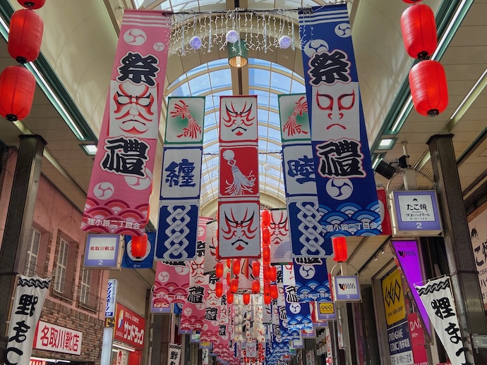 浴衣姿の若い女性も歩いて夏祭りかんはたっぷりなのだが、どうも日本語を話さない浴衣個性も混じっていたみたいだ。そうしてよく考えてみるとこのアーケードに下がっている垂れ幕なども、なぜに歌舞伎デザインだったりする?と気がついた。どうやら街のお祭りもグローバル化して外国人観光客向けに媚を売っているらしい。