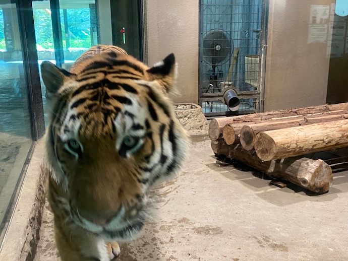虎はかなり広い育の中を早足で歩き回っていた。窓の外の猿系哺乳類を威嚇しているのだと思う。どう考えても、猿類は獲物であり、自分の下位種であると認識しているようだ。その俺様ドヤ顔をみたくて、虎が何周もする間に何度か撮ってみた。