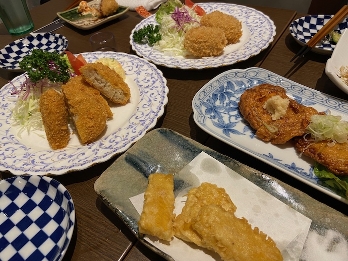 さて、この日はまず鱧の湯引き、茄子の煮浸し、地鶏の串焼きという、かなり健康志向の料理で始まったのだが、2ラウンド目になると同行者の強力な好みが発動され、テーブルの上はあっという間に茶色軍団な揚げ物で占拠された。