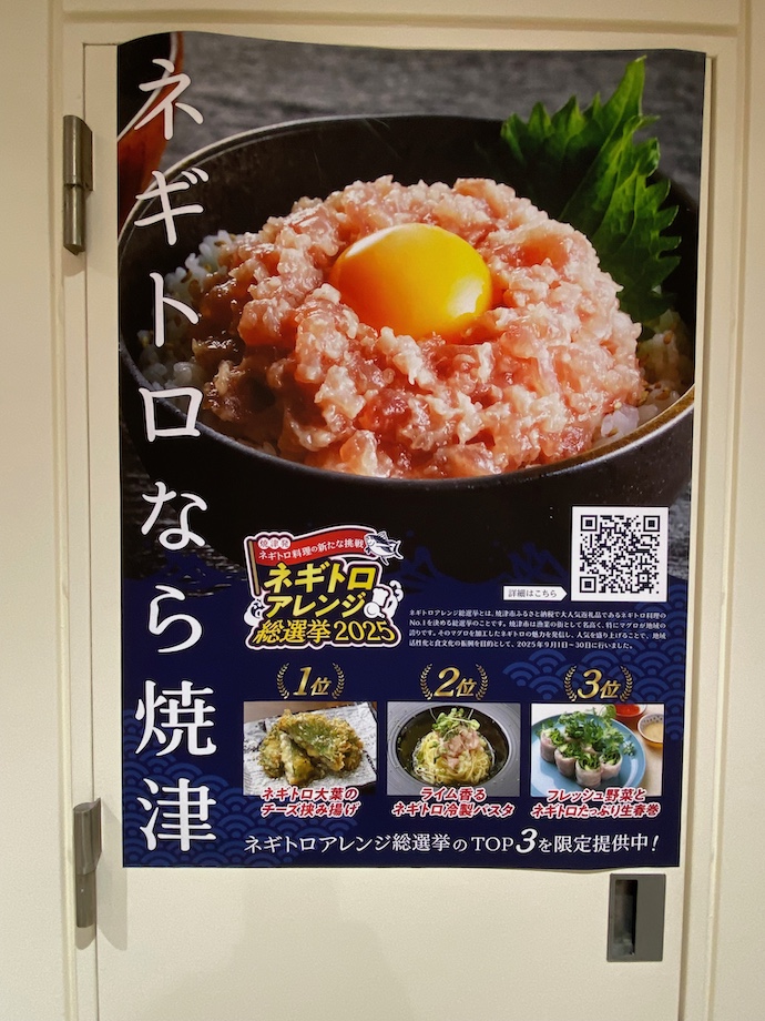 ポスター制作者の気持ちはわかるが、これ言って大丈夫と言いたくなる。確かにネギトロ丼好きな人には圧倒的にグイグイ迫るビジュアルではあるけど。でも、ネギトロは加工品だしなあ……………という非常に消化不良な思いを抱かせてくれた迷作ポスターでありました。