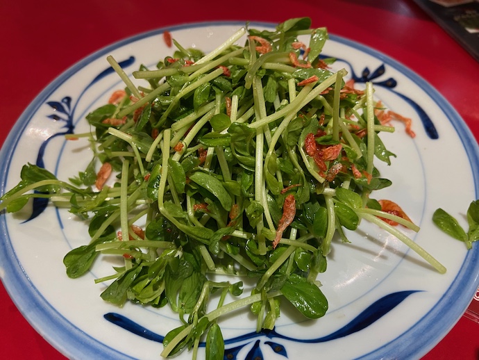 昼にも中華だったので、少し軽め、サッパリ系のメニューにしようと選んだのが豆苗と干し海老の和物。これはほとんど味付けのないオイル・アンド・ビネガー的なお腹に優しい料理だった。