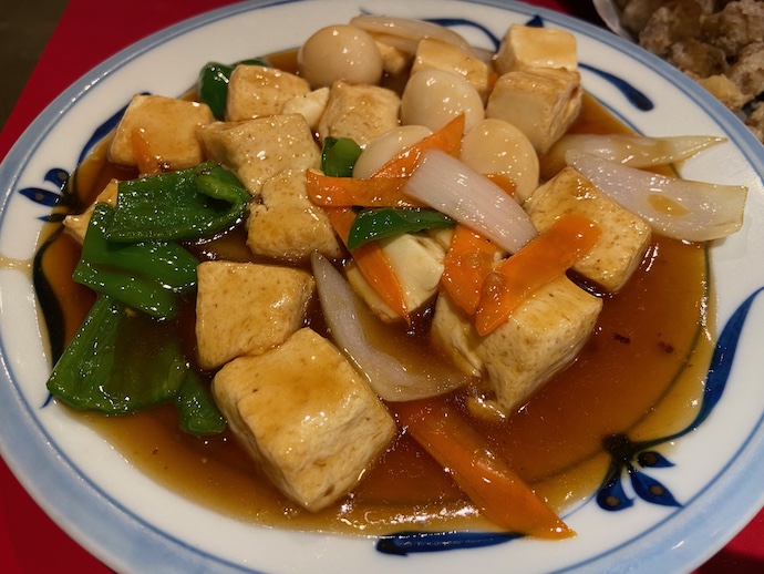 追加であれこれ注文したが、餃子などのサイドメニュー的なものに偏り、ちょっと炒め系の料理が食べたくなる。そこで選んだのが豆腐とエビの餡掛けだったが、何とこれは変形酢豚のようなもので、すっかり昼メニューとかぶってしまった。が、普通に美味しいので文句はない。どうやら豆腐は一度さっと油を潜らせたようで、表面の食感がかりふわ的になっているのがポイントだ。