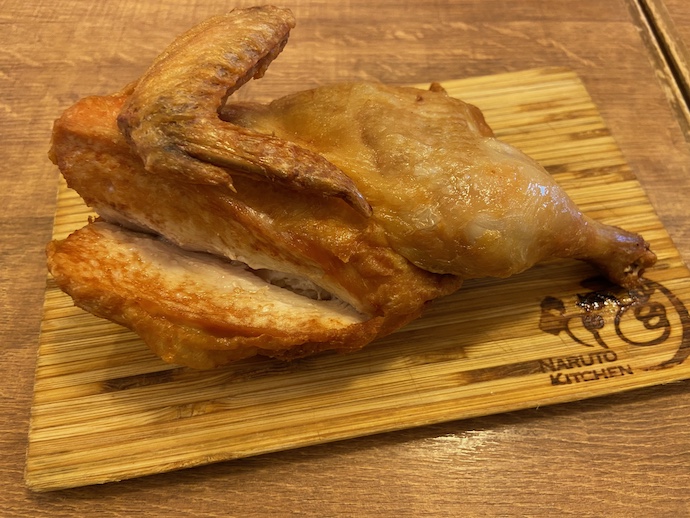 表面がカリッと揚がった皮部分に塩味を強く感じる。皮もうまいが中の鶏肉が実に鶏肉らしい肉の旨さを感じる。ザンギ、いわゆる鶏唐揚げではなかなかこうはならない。ザンギは細切れにした鶏肉を揚げるので、調理時間は短くて済むが、どうしても肉に火が通り過ぎる傾向にある。