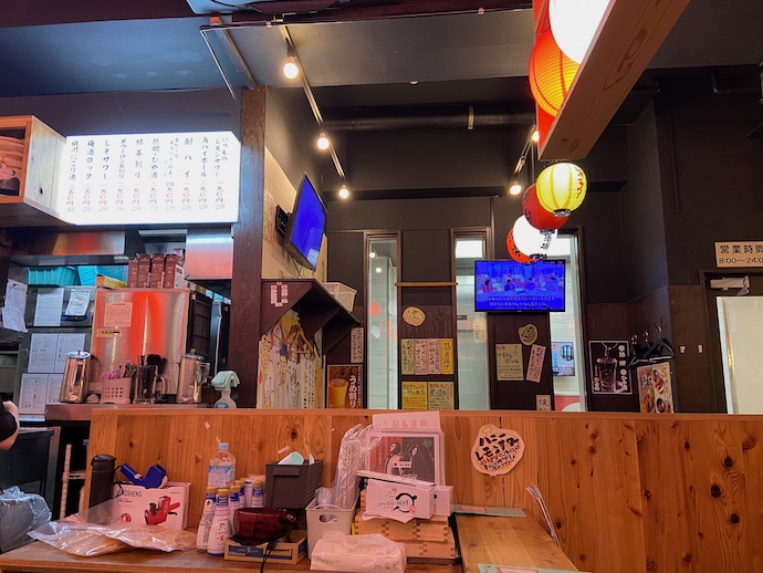 店内は昭和の居酒屋はこうであったような、チープさと賑やかさが混然となっている。ただ、昭和の居酒屋はデザイン云々などという深い考えはなく、酒メーカーからもらったポスターを無定見にベタベタと貼り、メニューは自分で手書きしたものを壁に並べるだけという、実用から生まれたチープさの現れだった。