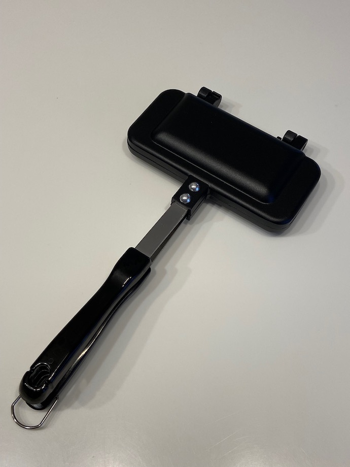 ホットサンドを作る道具は食パンを上下に2枚挟んで役物が一般的だ。ただそれでは量が多いという人のために、パン一枚用のホットサンドメーカーが作られた。それを手に入れたのは3-4年前のことだった。これはキャンプで2度ほど使ったが、どうも使い勝手が良くない。不精をしてパンおをり曲げたまま焼いたがあまりに焼きむらができる。焦げがきついといいところなしだった。
