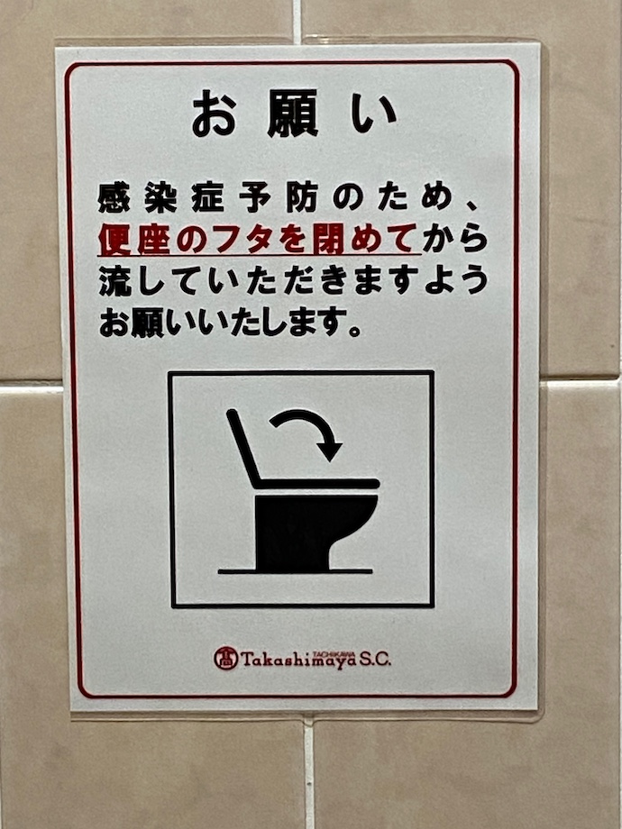 2年前に立川のモールで発見したトイレナイのサイン。今でもまだ貼られているのだろうか。そもそも、蓋を閉めて水を流すことに科学的な意味があるのだろうか。観戦初期の頃スーパーコンピィー田を使い、ランニング中の呼気がどのように流れて、周辺にウイルスを撒き散らすかというシミュレーションをしていたが、あれとどこかに通ったものがある。擬似科学信仰とでも言えば良いのだろうか。UFOに乗ってエイリアンが攻めてくるとか、改造人間を駆使して世界征服を図る結社があるとか、そんな与太話と同レベルではないかと思う。