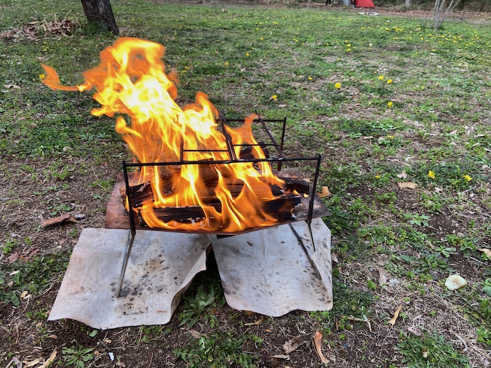 夕方少し冷えてきたので焚き火開始。火を見ながらのんびりと晩飯を食べた。夜8時過ぎにはのてしまった。キャンプに行けば早寝早起き。翌日の朝は陽が上る前には起きていた。30分ほどで後片付けをして撤収した。自宅近くにキャンプ場があるメリットは、この設営・撤収にかかる時間が短くて済むことだ。(持っていくものが圧倒的に少ないせいだ)