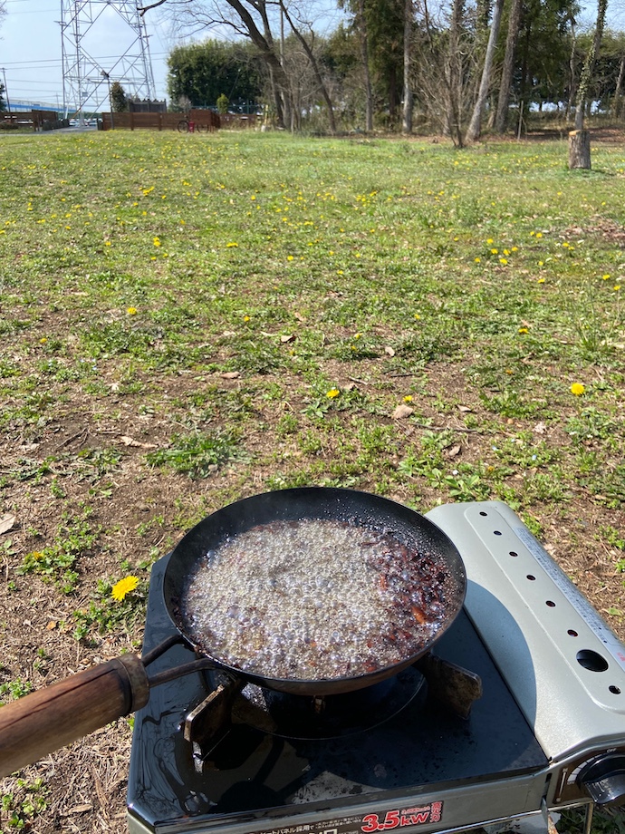 キャンプ場にはほぼ人がいない平日の昼下がり。3年ほど漬け込んでいたニンニクの醤油漬けをアラミ人にして油で揚げてみた。なかなか強烈な匂いがしてくる。そろそろ頃合いかと火を止めたが、マックとに焦げ付いてしまった。あと30秒ほど早く止めておけばちょうどよかったのだが。