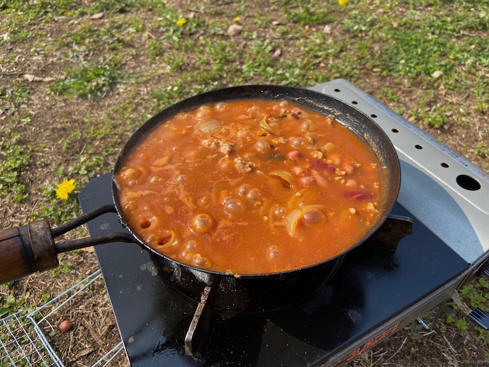 余っていたタコスソースを使って豆の煮込みを作ってみた。材料はミックスビーンと牛豚合挽きの挽肉に玉ねぎだけ。これをしばらく煮込んで、煮詰めてみた。こちらは群然の産物だが実に味の濃い煮豆料理になった。やはりビールのつまみに良いな。できればコロナビールでやるのが望ましい、という気分になった。お手軽メキシカン料理もどきだが、キャンプ飯とはこういうものだ。