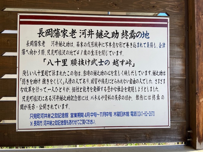 ただ、東国における戦地で、司馬氏と同じ感想を持つ人はどれくらいいるのだろうか。この看板を見る限り、河井継之助を支持する人も多いような気がするのだが。越後と会津の境目で倒れた武人には、やはり敬意を表すべきだろうと思った。