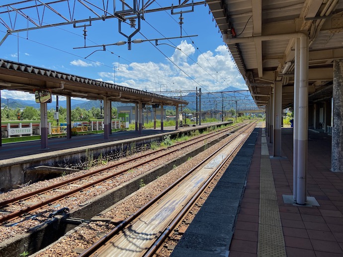 首都圏方向へ向かう乗客は、いわゆる「撮り鉄」らしき若者が多い。カメラや三脚を抱えている。それに加えて、「乗り鉄」の高齢者カップルが数組いた。平日の昼下がり茹だるような暑さの中、列車を待っている。