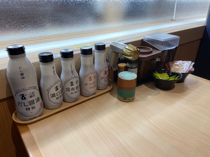 封印された小袋で、わさびなどが置かれている。昔は容器に入ってベルトの上を回っていたがテーブルごとの設置に変わったようだ。そして、ガリも小袋化されていた。