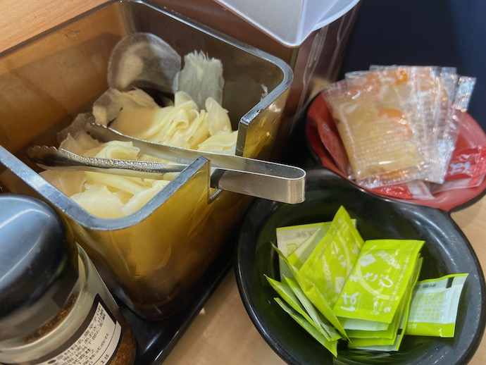 ただし、ガリ容器も残っていて、これは大量にガリを食べる客向けの対応だろう。たまに見かける、皿にガリを山盛りにしている客は(特に外国人観光客らしき人たちは)、小袋を大量に開けるのが面倒くさいと思うだろうということなのか。少なくともコスト面からの考えではないと推測する。
