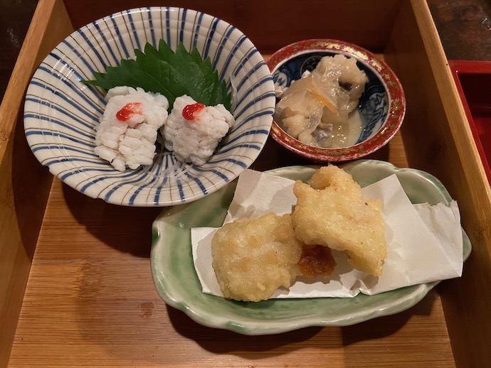 コースの注文だったので、実はうどんに辿り着くまで、あれこれと料理が出てくる。懐石っぽい料理の組み立てだった。なるほど、こうすれば「うどん屋」でも酒が楽しめるのか、と感心した。(今更だが)