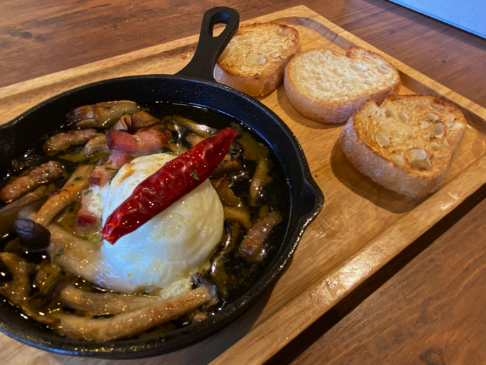 ただ、オリーブオイルに溶け出した塩味と旨味がたまらない。中に入れる具材は、日通りが良ければなんでも良いが、キノコ類や鳥肉が合うと思う。このメニューは温泉卵を投入していた。これが予想を遥かに超えてうまいと感じた。卵とアンチョビー・オリーブオイルの絡みが想定外の美味さだった。バゲットをガーリック風味のついたオイルにつけて食べると、食欲が増してくる。逸品というべきだろう。