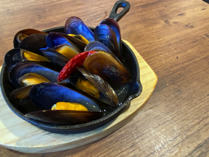 個人的には、貝の味として考えると、アサリの方がより味が濃いとは思うが、アサリではこの見栄えが作りにくい。おまけに、貝のみを食べる時にムール貝は大きくて撮りやすい。ファミレスに適した食材だろう。