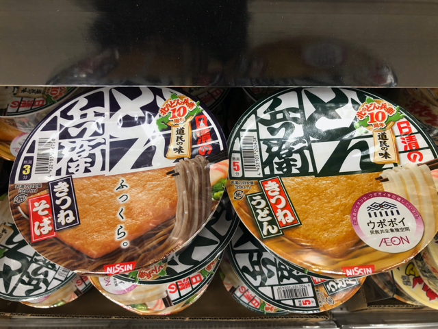 同じように写真左側にあるきつねそばは北海道版、右側のきつねうどんが全国版だと思う。少なくとも東京では「天ぷらうどん」「きつねそば」は見たことがない。日清どん兵衛愛好家の高校生が、この春からめでたく東京で大学生活を始めるとしたら、天ぷらうどんが見当たらなくて悲しい思いをするかもしれない。その時は残念ながら北海道の両親からどん兵衛を差し入れで送ってもらうか、東京版の天ぷらそばときつねうどんを買ってきて、うどんに天ぷらを乗せて食べる(残った蕎麦と揚げをどうするかという問題はあるが)しかない。それでも、敏感な舌を持っていたらつゆの味が違うと思うかもしれない。
