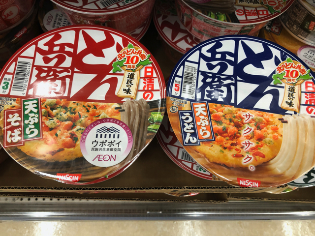 パッケージでは、ぱっと見わかりにくいので、よく見比べてもらうと、「天ぷらそば」と「天ぷらうどん」のどちらにも「道民の味」と書いてある。これはつゆの味付けが東京版、大阪版と違うということだろう。そして写真左側のウポポイというシールが貼ってある「天ぷらそば」が、通常版(全国共通版)どん兵衛だ。右側の天ぷらうどんは、北海道限定版だろう。