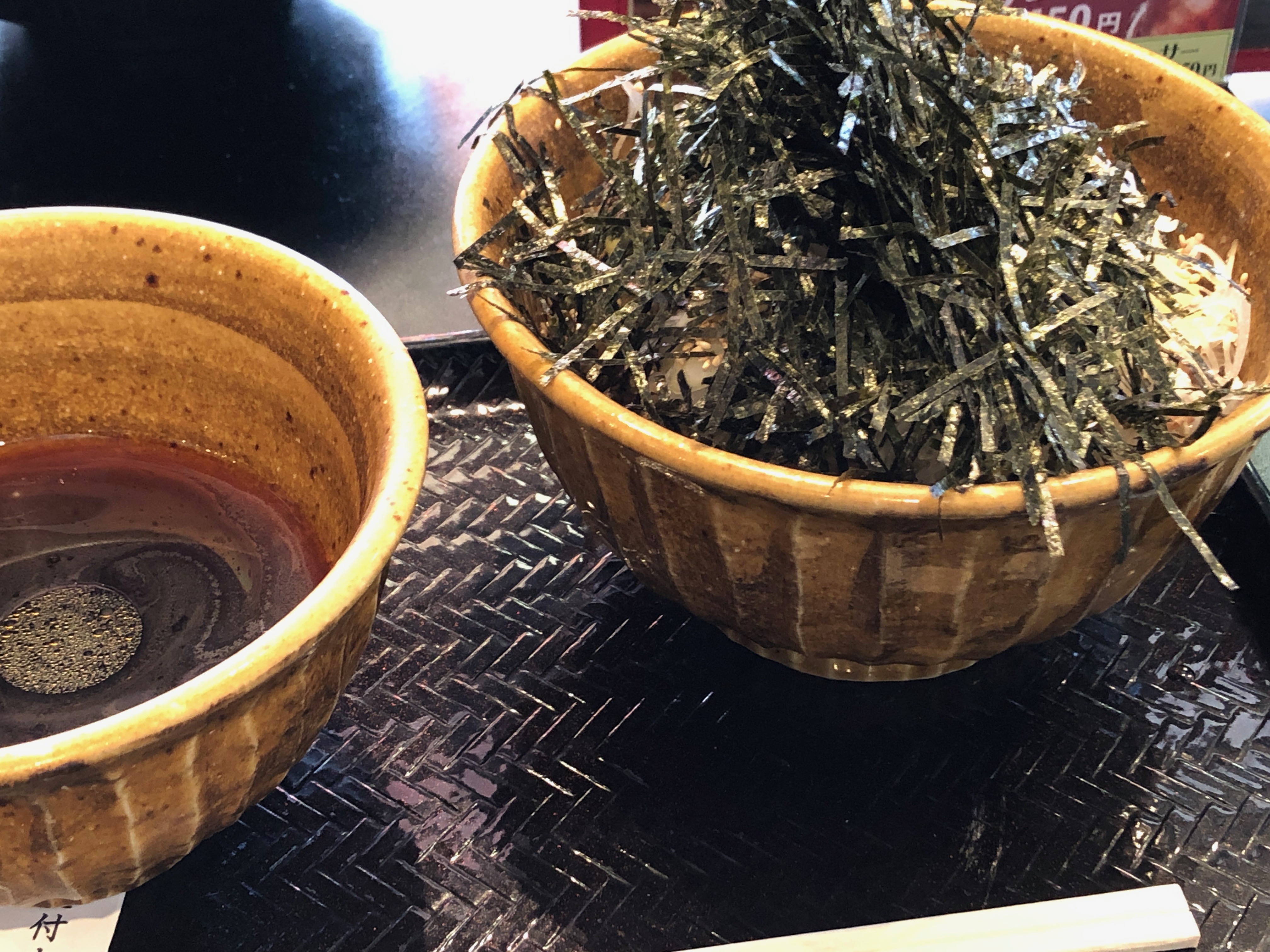 そして、もう一つの最近のお気に入り「ラー油蕎麦」。つゆはとても濃い甘辛で、ラー油の香りが強く感じる。そばつゆにラー油を入れることの違和感は、この「匂い」がいちばんの原因だろう。山盛りの海苔の下には茹でた牛肉薄切りが乗った極太の日本蕎麦がたっぷり。江戸前のそばなどとは全く別系統の太くて歯応えのあるそばは、山形の板蕎麦に近いような気がする。そばをすするというより、もぐもぐと噛み締める食べ物だが、そのせいか女性客が少ない。蕎麦の量やつゆの味付けやら、色々と女性には取り扱いが難しい食べ物かもしれないと思うが、いや、こういうストロングスタイルの店は女性に媚を振ってはいけないと強く言いたい。男だけ楽しんでもいいじゃないか・・・。