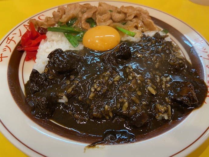 この店のオリジナルはオリエンタルライスという、ガツンとくるニンニク味の焼肉がのっかテイルライスメニューで、それにカレーを追加する。気分的には、カツカレーに近い。神保町の黒カレーの老舗が閉店したので、黒カレーを食べるには難度が高くなっているのだが、ここに来れば安心の定番メニューがお出迎えしてくれる。